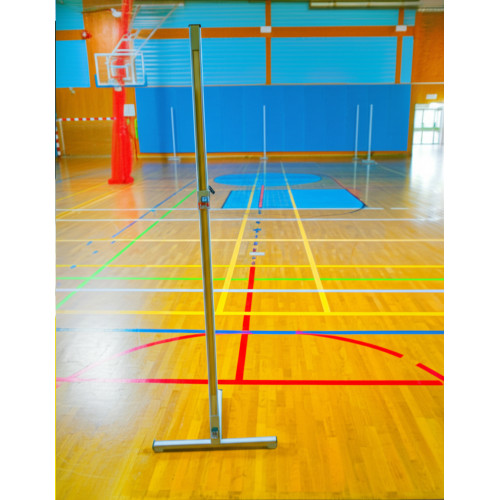 Данный комплект стоек идет с алюминиевой стойкой длиной 3 метра. Конструкция стоит на двух Т-образных основаниях. Стойки фиксируются крепежными винтами. На выдвижные стойки установлены подвижные кронштейны с полками для планки, полки регулируются по высоте и закрепляются с помощью прижимных винтов.
