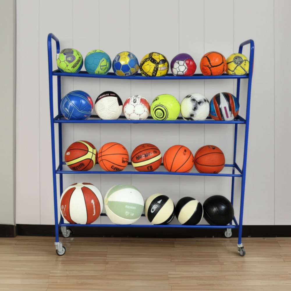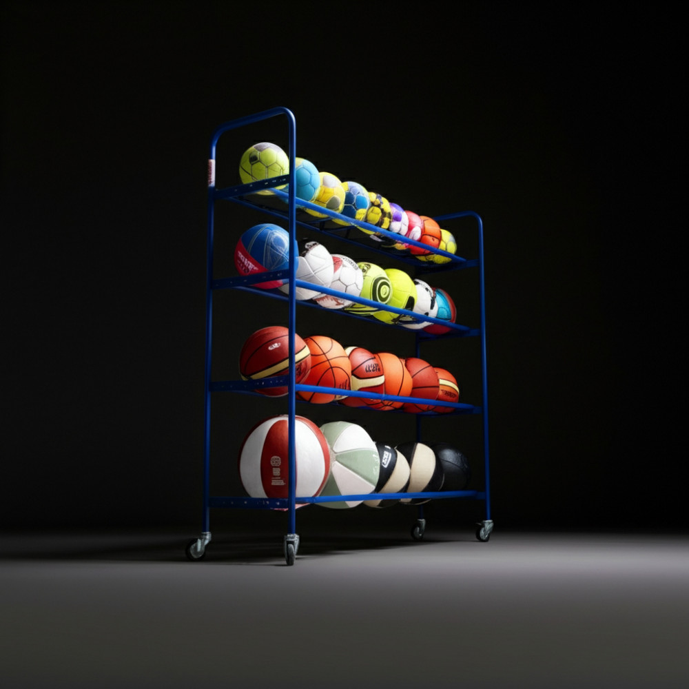 Данная конструкция на колесиках позволяет использовать её как стеллаж для хранения мячей и для их перевозки. Изготавливается для мячей различного диаметра и под разные виды спорта, такие как волейбол, баскетбол футбол и мини-футбол.